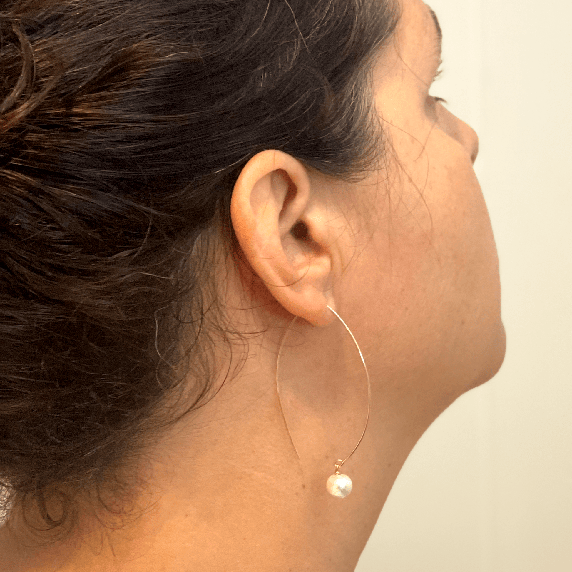 Elevate your style with our Minimalist Handmade Pearl Drop Earrings. The model is seen wearing the gold fill option, featuring a round AAA white pearl gracefully attached at the bottom. These earrings offer a touch of movement, adding a subtle yet captivating element to your look. Each pair is meticulously handcrafted, reflecting our commitment to quality and attention to detail. With their minimal design, these earrings effortlessly complement any outfit, from casual to formal. Embrace elegance and sophistication with these unique and versatile accessories. Make a statement with our handmade pearl drop earrings and experience the perfect blend of style and simplicity.